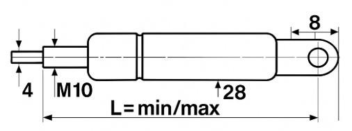 Terminal del vástago Rosca M10 con pasador Ø 4 Terminal del cilindro Ojal Ø 8 mm Diámetro del vástago 10 mm Diámetro del cilindro 28 mm Carrera 45 mm Fuerza 450 N Longitud mínima 192 mm Longitud máxima 237 mm