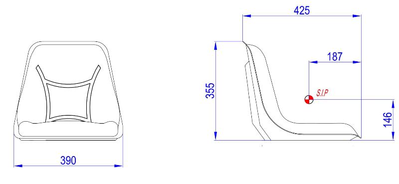 Asiento de una pieza (cubeta) de 390 mm. de ancho. Tapizado en PVC negro.